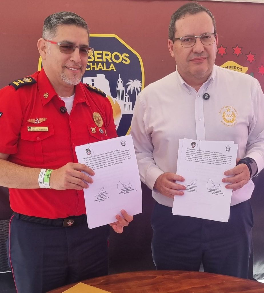 En el marco del III Congreso Nacional de Bomberos del Ecuador, el Superintendente del Cuerpo de Bomberos de Santiago (CBS), Gabriel Huerta Torres, junto al Jefe del Cuerpo de Bomberos Municipal de Machala, Coronel Ingeniero Javier Astudillo, firmaron el 25 de septiembre un convenio que dará inicio a diversas líneas de cooperación interinstitucional.