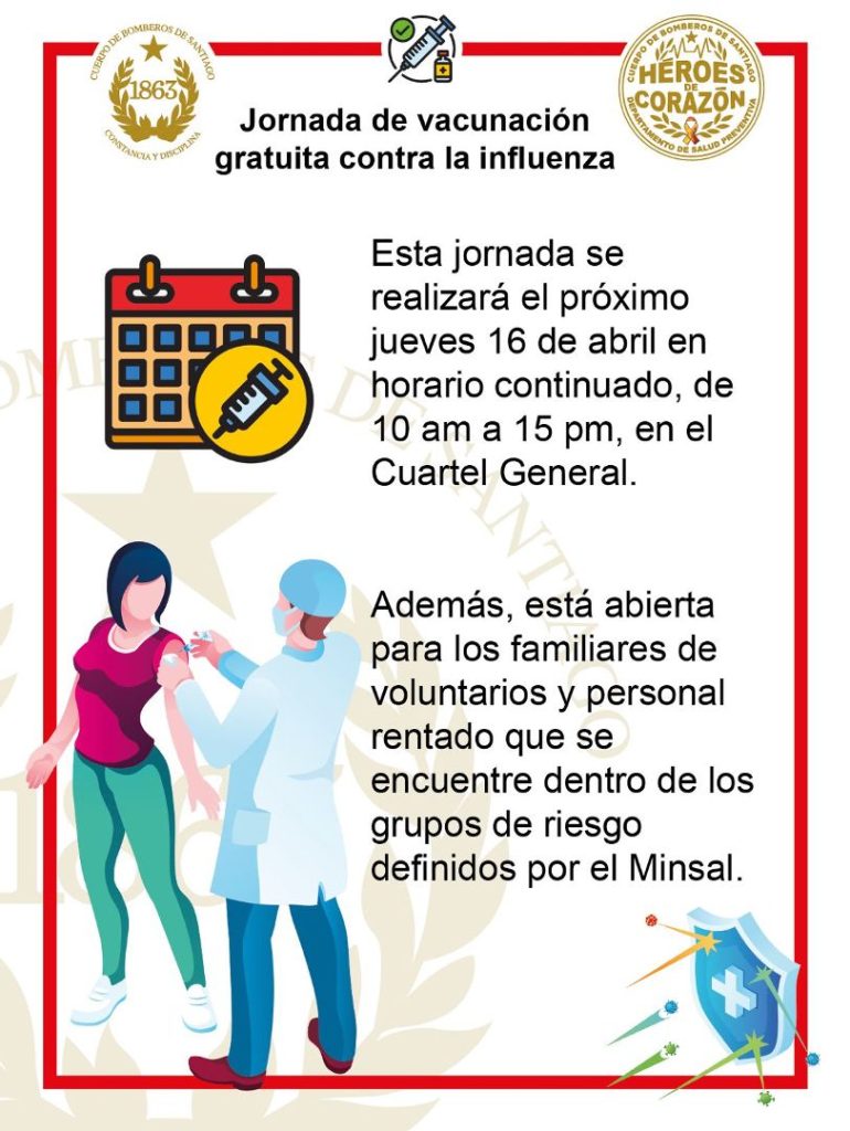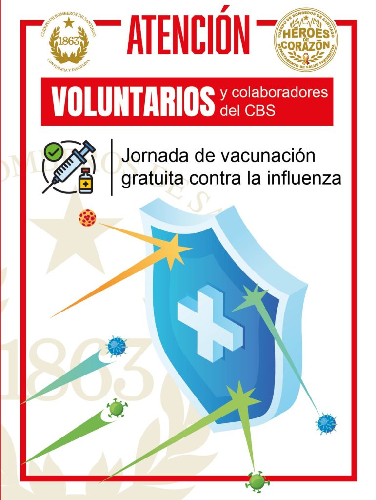El Cuerpo de Bomberos de Santiago, a través del programa Héroes de Corazón, iniciará el jueves 16 de abril, el proceso de vacunación contra la influenza para sus voluntarios y personal rentado.