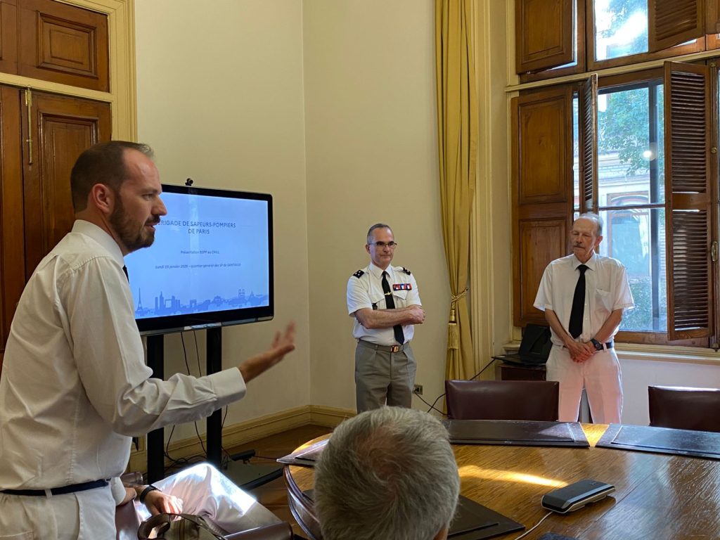 El Oficial arribó a Chile con la finalidad de participar en las actividades conmemorativas de la 4ª Compañía “Pompe France”, del Cuerpo de Bomberos de Santiago (CBS), y que se extendió a otras acciones que abarcaron aspectos protocolares, formativos y también informativos sobre la institución que dirige.