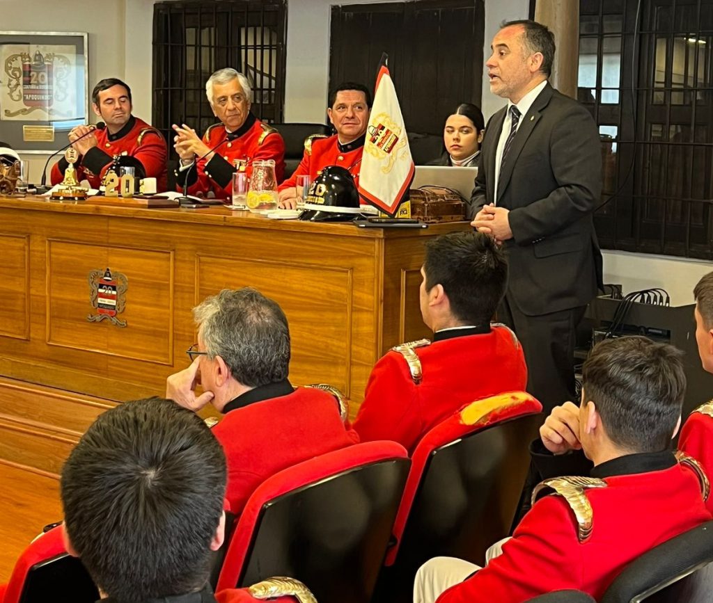 Posteriormente, en la testera de la sala de sesiones, se leyeron los saludos protocolares recibidos desde diversas compañías, voluntarios y oficiales. Después, la secretaria de brigada, Valentina Céspedes, tomó la palabra para relatar los hitos que dieron origen a la brigada, marcando un momento de reconocimiento y memoria institucional.