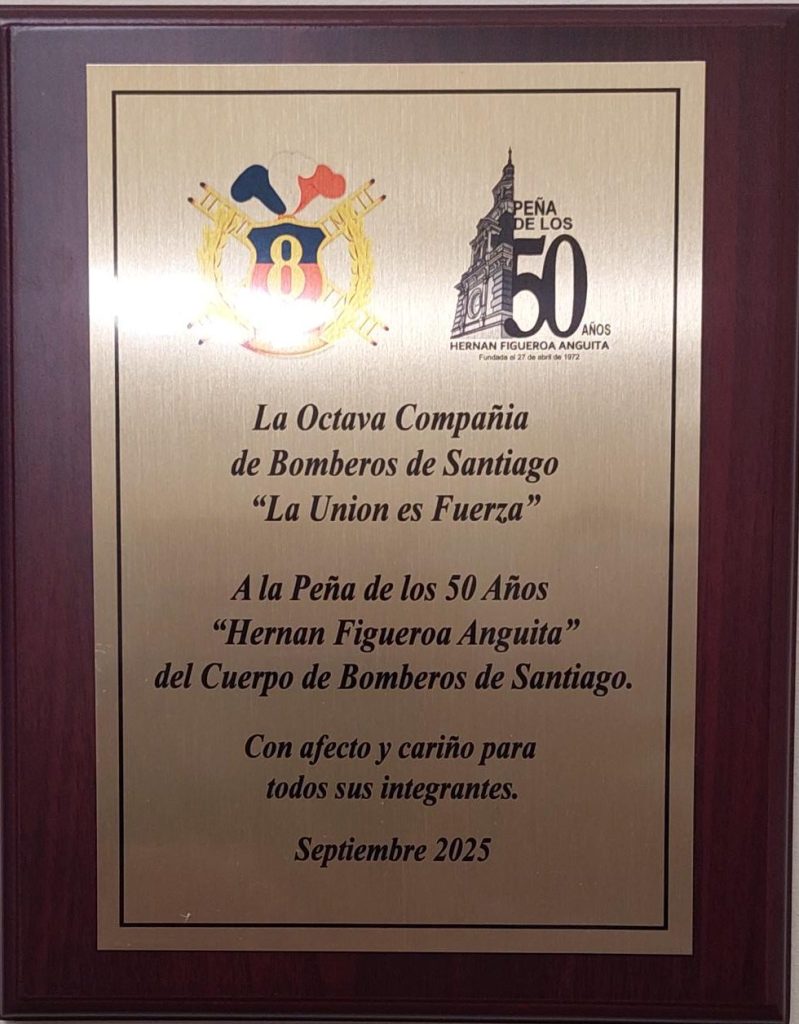 “La 8ª Compañía de Bomberos de Santiago ‘La Unión es Fuerza’ a la Peña de los 50 Años ‘Hernán Figueroa Anguita’ del Cuerpo de Bomberos Santiago, con afecto y cariño para todos sus integrantes”.