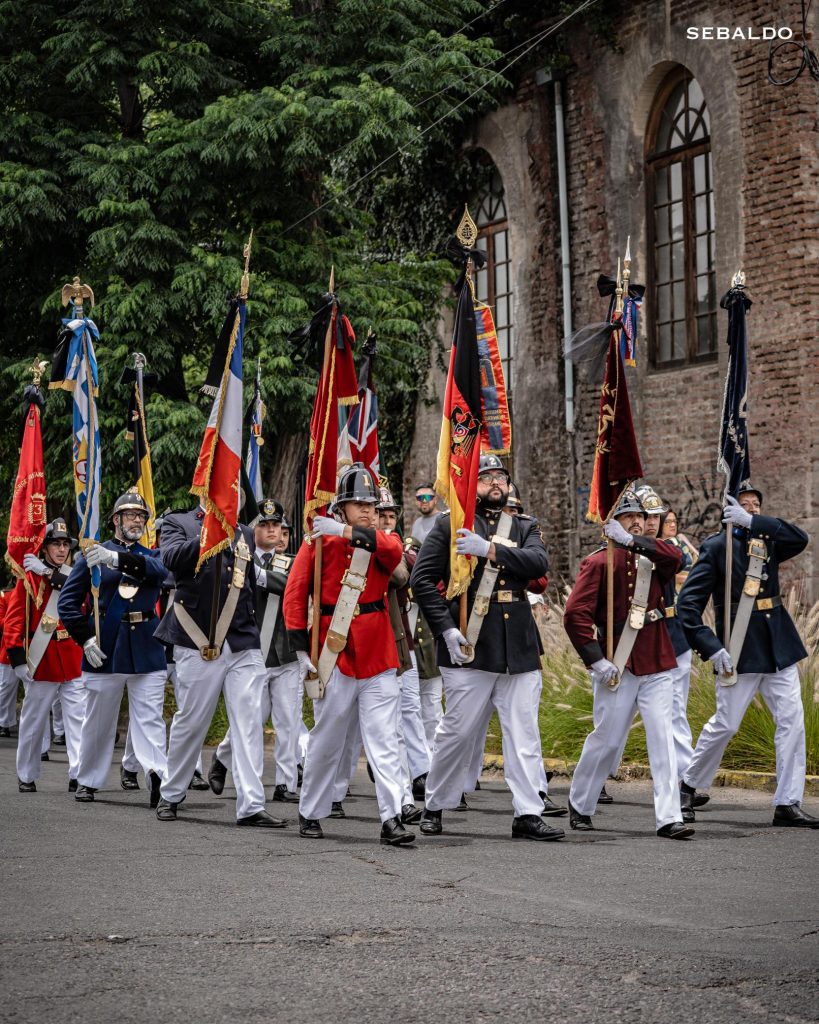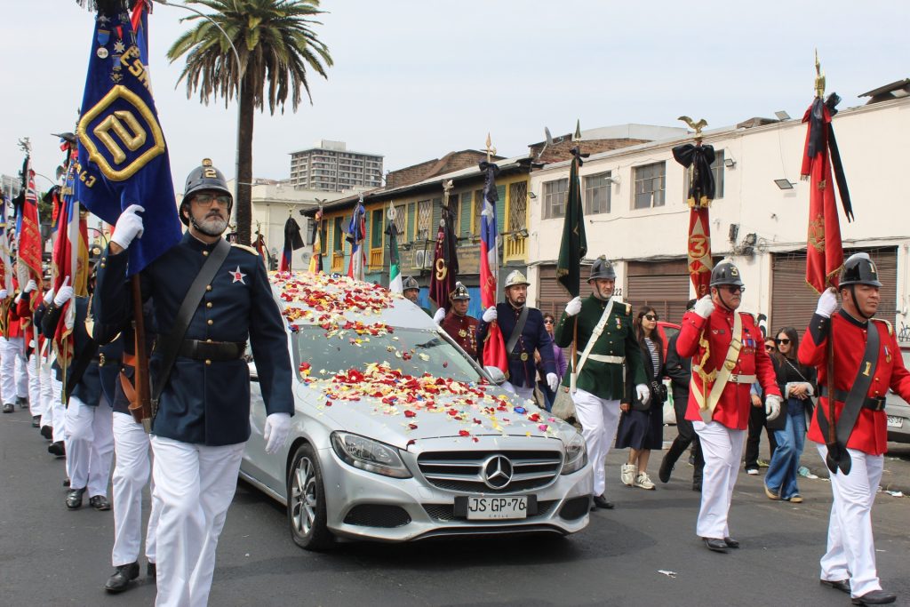 Ya en calle Santo Domingo esperaban las delegaciones de las Compañías del CBS, formadas y con sus estandartes de luto, para iniciar la marcha a los sones de la Banda Instrumental de la Institución. La formación la lideró el Superintendente, Gabriel Huerta; el Vicesuperintendente, Álvaro Lara Alba; el Alcalde de Santiago, Mario Desbordes Jiménez, y el Presidente Nacional de la JNCB, Juan Carlos Field, llevando el rumbo hacia el poniente por Santo Domingo hasta Morandé, donde doblaron hacia el norte para pasar por General Mackenna al oriente y cruzar el puente Las Vegas donde las y los floristas de la Pérgola, tras el paso de la formación, esperaron la llegada de la carroza motorizada que precedía a los voluntarios de la 6ª Compañía.