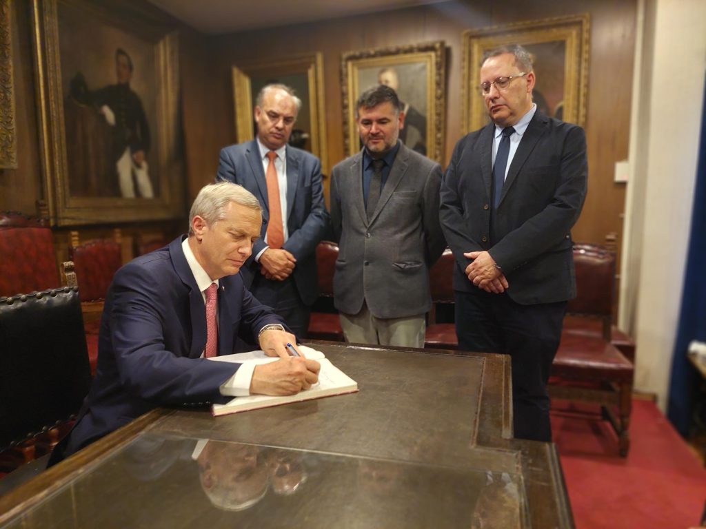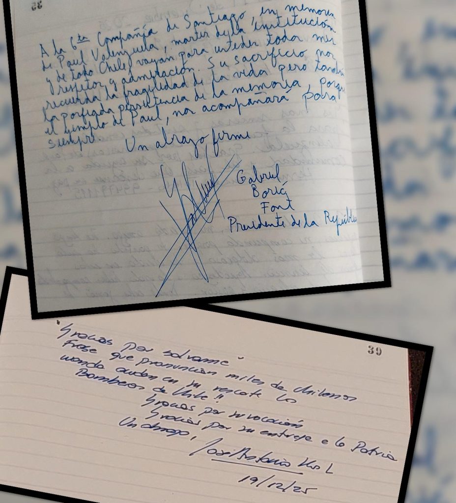 La presencia del Presidente Boric en tinta y papel señala: “A la 6ª Compañía de Santiago, en memoria de Paul Valenzuela, Mártir de la Institución y de todo Chile, vayan para ustedes todos mis respetos y admiración. Su sacrificio nos recuerda la fragilidad de la vida, pero también la porfiada persistencia de la memoria, porque el ejemplo de Paul nos acompañará para siempre. Un abrazo firme. Gabriel Boric, Presidente de la República”.