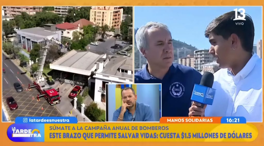 ● También fue importante la aparición, el viernes 17 de octubre, del Comandante del CBS, Giorgio Tromben Marcone, en el espacio “La Tarde es Nuestra”, de Canal 13, con Chantal Aguilar y Alfonso Concha. Esta vez con la particularidad de que el jefe del mando activo fue entrevistado a más de 20 metros de altura, en el canastillo del brazo articulado del MX-13, de la 13ª Compañía “Providencia”. Y su mensaje fue “la necesidad de estos 30 mil nuevos socios colaboradores del Cuerpo nos permitan renovar equipos para atender emergencias como la del 10 de julio pasado, cuando este MX-13 y otros carros con Escalas telescópicas permitieron rescatar más de 100 personas del edificio”.
