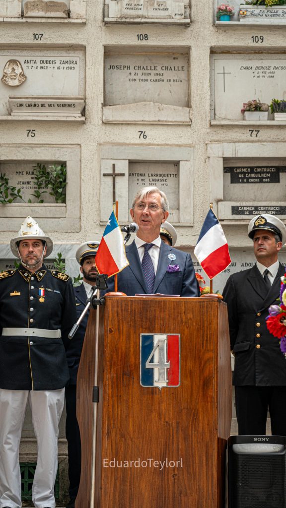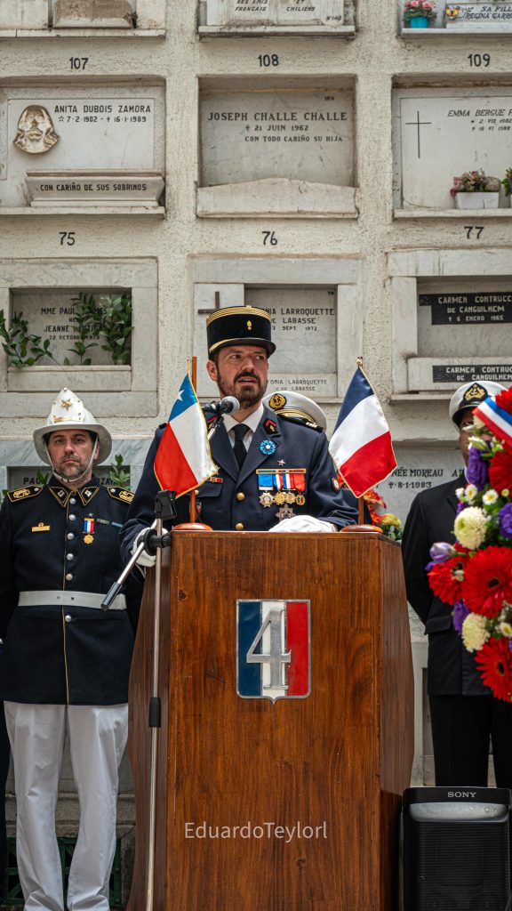 En la oportunidad, hicieron uso de la palabra para recordar a los caídos el Embajador Cyrille Rogeau y el Director de la “Pompe France”, Alonso Segeur, quien de acuerdo a lo dado a conocer por la 4ª Compañía, señaló que “en el Cementerio General de Santiago, nos reunimos para conmemorar el Armisticio y rendir homenaje a quienes dieron su vida por la libertad, así como a nuestros mártires caídos en el campo de honor”.