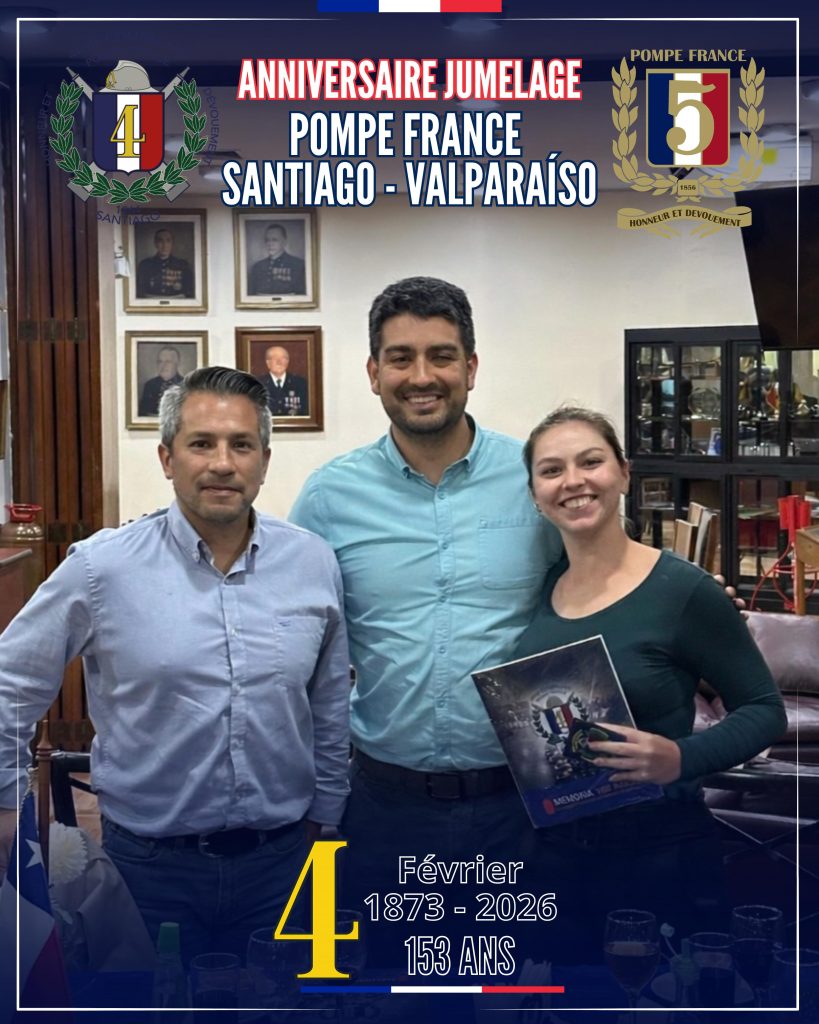 La Cuarta Compañía “Pompe France”, del Cuerpo de Bomberos de Santiago (CBS), y la Quinta Compañía “Pompe France”, del Cuerpo de Bomberos de Valparaíso CBV), celebraron el pasado 4 de febrero el 153° aniversario del Canje de hermandad bomberil más antiguo de Chile o Jumelage en francés.
