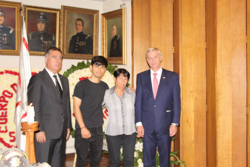 Posteriormente, ingreso al cuartel donde entregó sus sentidas condolencias y palabras de consuelo a la viuda, hijo y madre de Paul Valenzuela. Además, al conformar la Guardia de Honor cerca del féretro del 50° Mártir de la Institución, solicitó a Matías, hijo del fallecido “sextino”, que compartiera el homenaje a quien fuera su padre junto al Superintendente del CBS; el Comandante, Giorgio Tromben Marcone, y el Alcalde de Santiago, Mafrio Desbordes Jiménez,