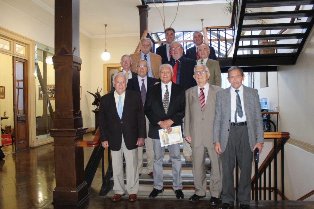 Tras tener el certificado de su antigüedad acreditada por años de servicios, el Miembro Honorario de la Institución Carlos Miranda fue felicitado y abrazado por sus camaradas y amigos generacionales de la 13ª Compañía “Providencia”, con quienes posó para una foto recordatoria en el Cuartel General del CBS.